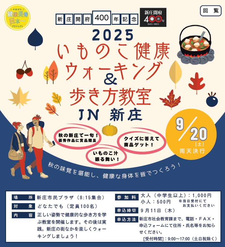 正しく健康的な歩き方を学ぶ教室を開催後、実際に新庄の街なかを楽しくウォーキング!いものこ汁の振る舞いや軽スポーツ体験も!新庄開府400年の記念すべき年に、一緒に新庄を歩いてみませんか!? ◆日時:2025年9月20日(土) 8:15〜 集合・受付 8:40〜 オープニングセレモニー 9:00 歩き方教室 9:30〜 ウォーキングスタート 11:30〜 プラザ到着、軽スポーツ体験 12:00 いものこ汁振る舞い 13:15 イベント終了 ◆会場:新庄市民プラザ ◆参加料:大人1000円、小人500円(当日受付にて支払い) ◆申込方法:専用申込フォーム、FAXおよび電話 ◆申込〆切: 9月11日(木) ○案内チラシ&コース図は【こちらから】 ○申込フォームは【こちらから】 | |