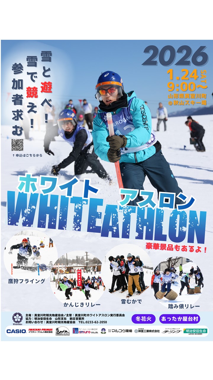 真室川町秋山スキー場を舞台に、今年も白銀の戦い「WHITE ATHLON」を開催します。