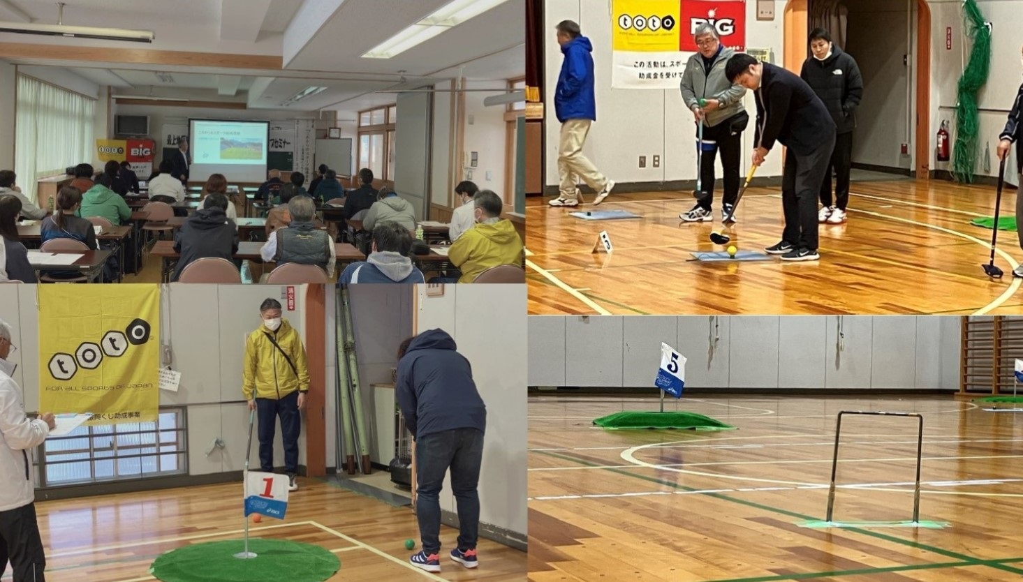 後半は実技としてフロアゴルフを体験しました。NPO法人Oh蔵SPORTの柳田一義氏と菅野明氏を講師に、4〜5名のグループでホールを回りながらフロアゴルフを楽しみました。寒い中でしたが、グループ毎にたくさんの歓声や拍手が出るなど大いに盛り上がりました。
