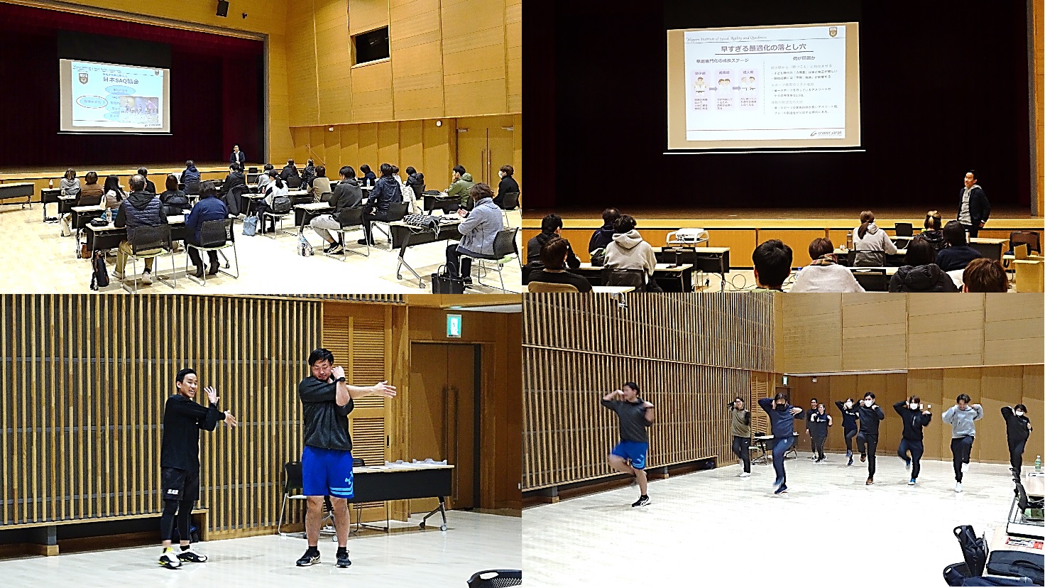 12月13日(土)に標記研修会を三川町子育て交流施設テオトルで開催しました。この研修会は山形県広域スポーツセンターの事業で、庄内地区ではクラブの指導者やマネジャーの資質向上、クラブの更なる発展と生涯スポーツ社会の実現を図ることを目的に開催しています。今年度2回目の開催となり、管内総合型クラブ関係者、生涯スポーツ主管課担当者等25名の参加がありました。 日本SAQ協会レベル3インストラクター兼株式会社クレーマージャパントレーニングコーチの渡邉研氏から「育成年代の運動能力を高めるSAQトレーニング」について、実技を取り入れた講義をしていただきました。SAQとはスピードを重心移動の速さ、アジリティを運動時に身体をコントロールする能力、クイックネスを刺激に反応し早く動き出す能力と定義して、速さを細分化したトレーニングです。参加者から多くの質問があり、講師の渡邉氏からは実技を示しながら丁寧に説明していただきました。